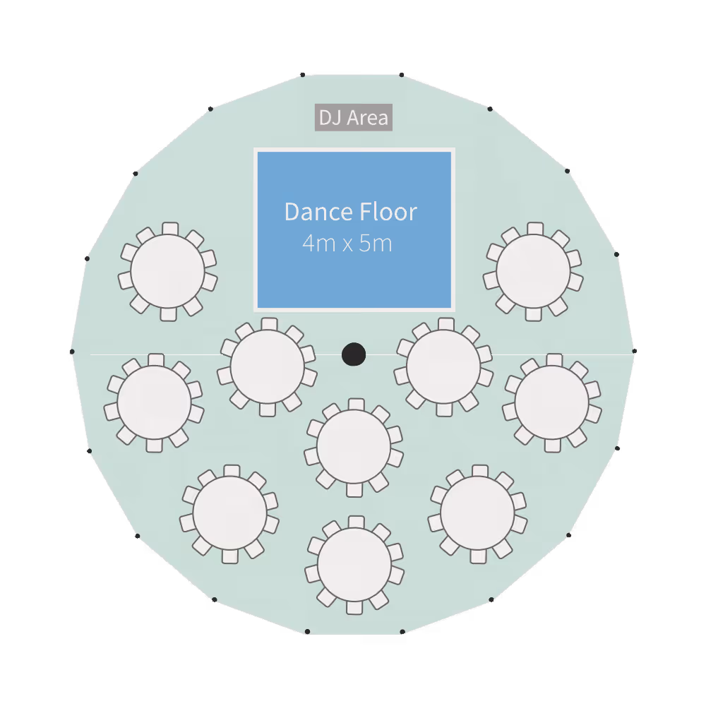 Our Celeste Pole Marquee is a traditional structure with exposed timber legs and rounded ends. We offer it in a variety of sizes and it comes complete with woven matted flooring, LED uplighters and fairy lights throughout.