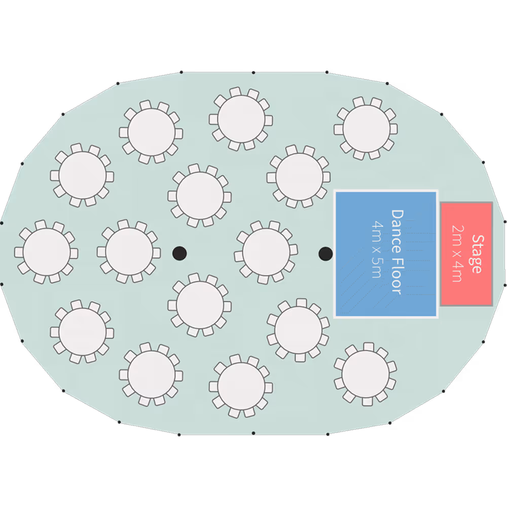 Our Celeste Pole Marquee is a traditional structure with exposed timber legs and rounded ends. We offer it in a variety of sizes and it comes complete with woven matted flooring, LED uplighters and fairy lights throughout.