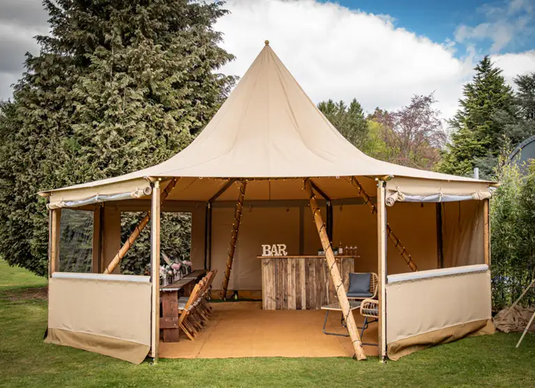 Our Nimbus tents come with a natural colour canvas and are available in 7m diameter. Our Nimbus complements larger events, providing separate space for your bar or breakaway area. On its own it's great for garden parties or informal gatherings and comes complete with fairy lights and flooring.